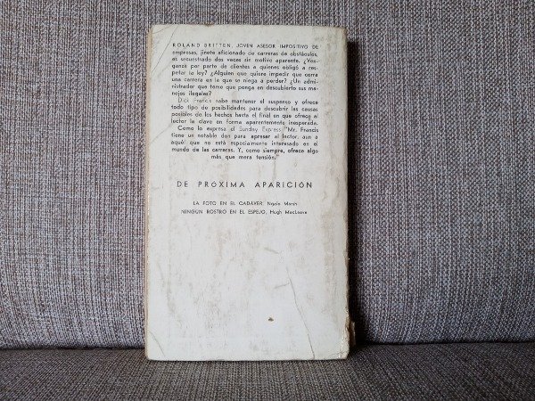 Sinopsis: Roland Britten, joven asesor impositivo de empresas, jinete aficionado de carreras de obstáculos, es secuestrado dos veces sin motivo aparente. ¿Venganza por parte de clientes a quienes obligó a rspetar la ley? ¿Alguien quen quiere impedir que corra una carrera en la que se niega a perder? ¿Un administrador que teme que ponga en descubierto sus manejos ilegales? Dick Francis sabe mantener el suspense y ofrece todo tipo de posibilidades de los hechos hasta el final en que ofrece el lector la clave en forma aparentemente inesperada.