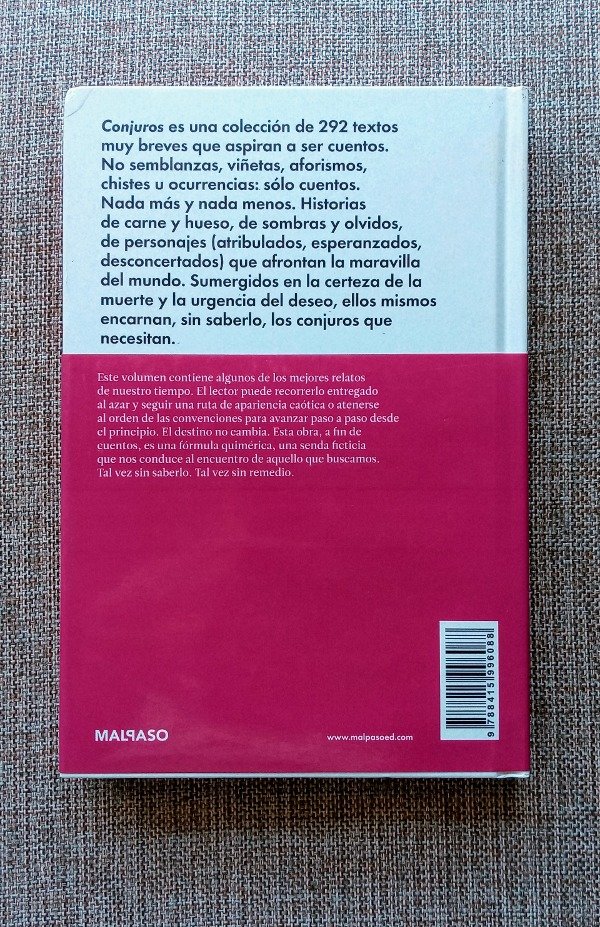 Sinopsis: Conjuros es una colección de 292 textos, muy breves, que quieren ser cuentos. No semblanzas, viñetas, aforismos, chistes ni ocurrencias, sino cuentos. Historias de personajes de carne y hueso, de sombra y olvido, que se enfrentan ?atribulados, esperanzados, desconcertados? a la maravilla del mundo. Carcomidos por la certeza de la muerte y por la urgencia del deseo, estos personajes son, sin que ellos lo sepan, esos mismos conjuros que necesitan. Este volumen incluye varios de los mejores cuentos breves de nuestro tiempo.