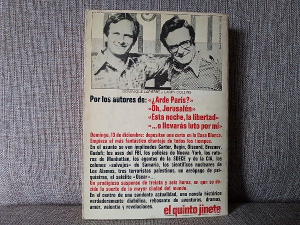 Sinopsis: El quinto jinete es una novela de 1980 dentro del género tecno-thriller escrita por Larry Collins y Dominique Lapierre. La historia gira alrededor de dirigente libio Gaddafi que toma como rehén a toda Nueva York con la amenaza de activar una bomba nuclear escondida en la ciudad.