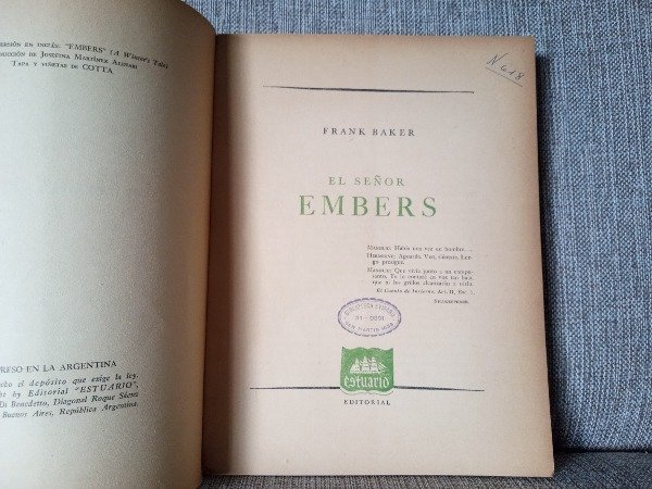 Sinopsis: El señor Thomas Embers aguarda, en la soledad de la noche, la llegada de Edna. Ha tendido su mesa para ella; y espera... Hace años que espera a Edna: desde su adolescencia ya lejana todas las noches cumple los mismos ritos, y cada una le trae la misma esperanza, y lo deja con la misma amargura. Sabe, no obstante, que vendrá: que volverá a ver a esa mujer que lo abandonó para realizar un matrimonio "respetable". ¿Qué sucederá entonces? ¿Cómo reacciona un hombre al confrontar sus sueños de toda una vida con la realidad de una noche? El problema presenta un profundo atractivo psicológico; más aun cuando el hombre no es un hombre común, sino un ser tan deliciosamente alejado de vulgar como el señor Embers, músico, poeta, filósofo, orador de barricada, excéntrico, mezcla de sabiduría y de locura. Es este problema dual de la realidad, este contrapunto entre lo verdadero y lo imaginado, lo que presta un encanto especial a este libro. Embers es el hombre que ha buscado refugio en la imaginación; vive casi de nada, con sus cinco gatos y sus sueños; los ignorantes lo observan con desconfianza; los más lúcidos, con indulgente cariño, con profunda curiosidad, quizás con una pizca de admiración. El mensaje de Frank Baker es sencillo y profundo: la vida humana pierde su sentido en un mundo donde no hay amor. Periodista, compositor, organista, dramaturgo, Frank Baker, nacido en Londres, es uno de los escritores más destacados de habla inglesa. Sobre su mérito, baste repetir, con un crítico de su patria: "Desde la publicación de los cuentos de Max Beerbohm, ningún escritor ha tocado el tema metafísico con más éxito, o al menos con más lógica, ni con tanto humos y tan evidente buen gusto."