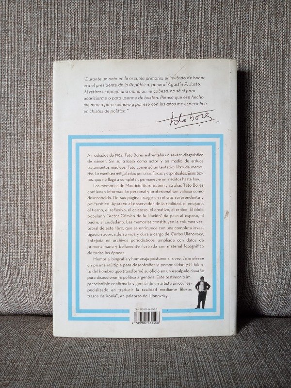 Sinopsis: A mediados de 1994, Tato Bores enfrentaba un severo diagnóstico de cáncer. Sin su trabajo como actor y en medio de arduos tratamientos médicos, Tato comenzó un tentativo libro de memorias. La escritura mitigaba las penurias físicas y espirituales. Esos textos, que no llegó a completar, permanecieron inéditos hasta hoy. Las memorias de Mauricio Borensztein y su alias Tato Bores contienen información personal y profesional tan valiosa como desconocida. De sus páginas surge un retrato sorprendente y polifacético.